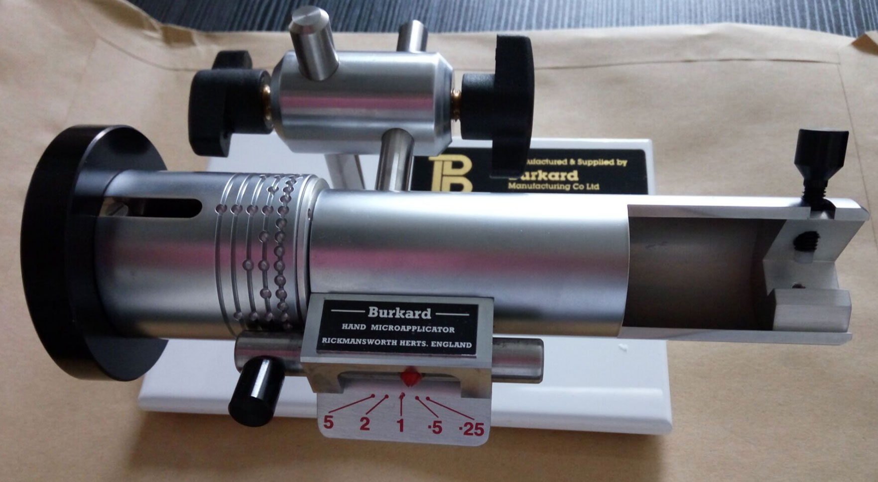 可變滴量微量施藥器裝有一個1毫升 Burkard注射器,采用luer式安 裝,可通過滑動一個選擇控制旋鈕來選擇點滴量。點滴量有0.25, 0.5, 1, 2 和 5μl可供選擇。施藥器由不含鐵的材料構成,其組成部分經極 度陽極處理或電鍍為光亮的鉻合金磨光表面,其組裝方式靈活,使它在使用中可夾固于任何位置。10ml注射器和施藥器可供應的點滴量最多為50μl。
